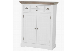 Fleur MeidenkastHet romantische en landelijke meubelprogramma Fleur bestaat uit diverse trendy, witte meubelen met vergrijsde houten bladen.De meidenkast is voorzien van 2 openslaande deuren en 4 opbergladen.