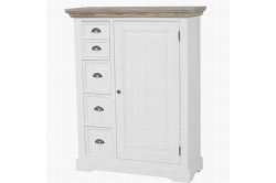 Fleur SpekkastHet romantische en landelijke meubelprogramma Fleur bestaat uit diverse trendy, witte meubelen met vergrijsde houten bladen.De spekkast is voorzien van 1 openslaande deur en 5 opbergladen.