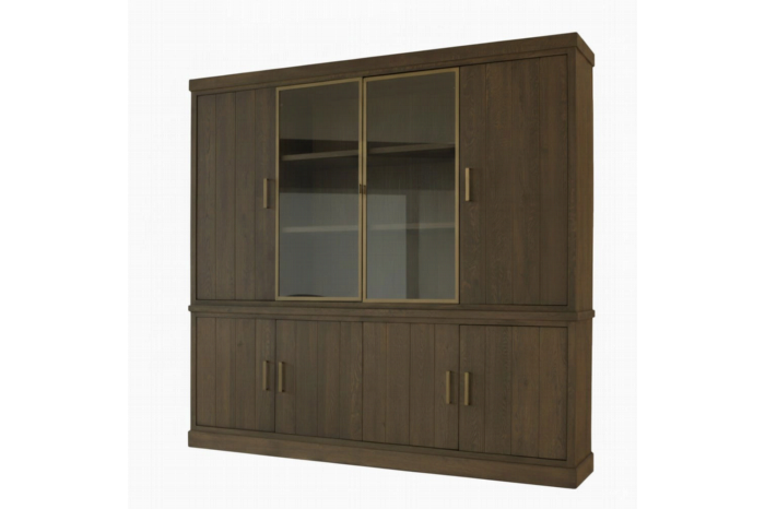 Ontdek de perfecte combinatie van luxe, functionaliteit en tijdloos design met deze stijlvolle opbergkast.Gemaakt van hoogwaardig hout en afgewerkt in een warme, diepe tint straalt deze kast pure elegantie uit. De subtiele verticale houtstructuur geeft het geheel een verfijnde en natuurlijke uitstraling, terwijl de solide messingkleurige handgrepen en de sierlijke omlijsting rondom de glazen schuifdeuren een moderne, luxe touch toevoegen.