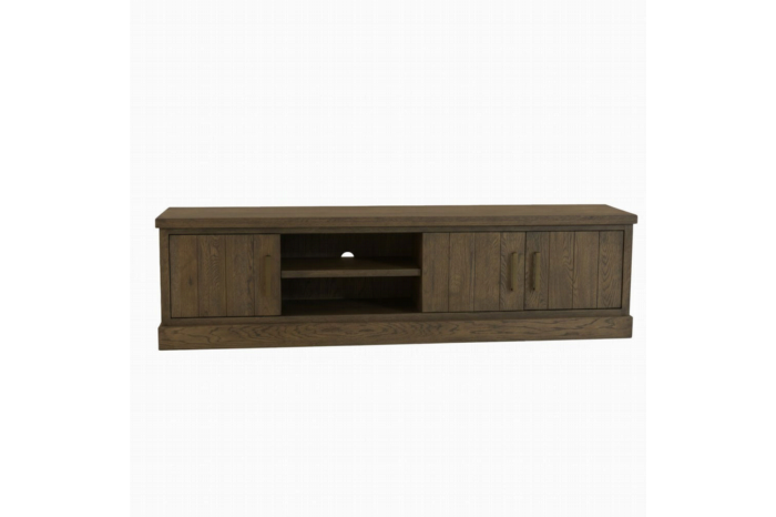 Breng rust en organisatie in uw woonkamer met dit stijlvolle en zeer functionele TV-meubel. De robuuste uitstraling van het donkere eikenhout gecombineerd met de kenmerkende verticale panelen, maakt van dit meubelstuk een warm en stoer middelpunt onder uw televisie.