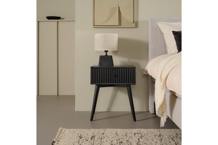 Dit moderne kastje genaamd Sem is een ware eyecatcher. De lade is voorzien van een verticale lattenstructuur, wat zorgt voor een unieke uitstraling. Het kastje is gemaakt van zwart mangohout en heeft een elegant gouden knopje als accent. Met afmetingen van 45x35 en 55 cm hoog is Sem perfect als nachtkastje, maar kan ook dienen als bijzettafeltje naast je bank of stoel. Maak de look compleet met een mooie lamp voor een sfeervol geheel. Het kastje is gemaakt van hoogwaardig mangohout en heeft al kunststof vloerbeschermers onder de poten.