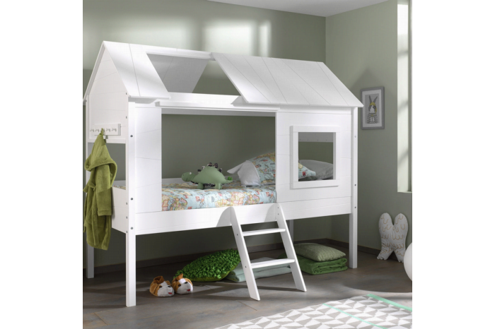 Dit bed is gemaakt van beige/grijs gelakt MDF met gebeitst massief grenen en wordt geleverd zonder lattenbodem en matras.Het boomhutbed maakt je kinderkamer door het dak, de ladder, de kapstok en de ramen tot een echt speel/slaappaleisje. Bijpassende gordijntjes dienen apart te worden bijbesteld.