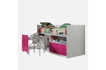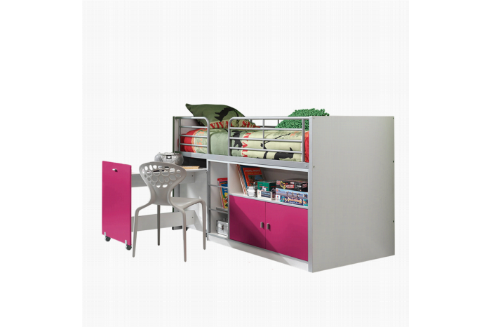 Deze strak gevormde halfhoogslaper met fuchsiakleur gelakte voorfronten heeft links een handig uitschuifbaar volwaardig bureau, middenin 3 open vakken en rechts 2 fuchsiakleur gelakte deuren met daarboven nog een breed open vak. De 2 metalen uitvalhekken zorgen voor een prima bescherming. Het bed is inclusief een houten lattenbodem, maar een matras van 90×200 cm. dien je wel los bij te bestellen. In de collectie van huisenthuis.nl heb je hierin een prima assortiment.