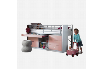 Deze functionele halfhoogslaper met roze gelakte voorfronten heeft links een handig uitschuifbaar bureaublad op metalen ladegeleiders, daaronder 2 roze gelakte deuren en 2 open vakken en rechts 3 roze gelakte brede laden. Het metalen uitvalhek over de volle lengte zorgt voor een prima bescherming. Aan de rechterkant zorgt een metalen trap ervoor, dat je gemakkelijk kunt gaan slapen. Het bed is inclusief een houten lattenbodem, maar een matras van 90×200 cm. dien je wel los bij te bestellen. In de collectie van huisenthuis.nl heb je hierin een prima assortiment.