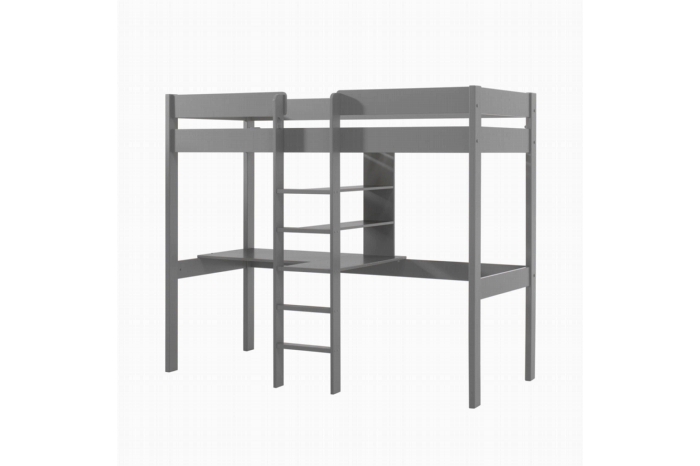 Deze multifunctionele hoogslaper is een aanwinst voor elke kinderkamer. De hoogslaper is vervaardigd uit Scandinavisch grenen en is grijs gelakt. Links van de trap is een bureaublad met aan de rechterzijde 2 planken om al je spullen op kwijt te kunnen, deze kan ook rechts gemonteerd worden. De lattenbodem is inbegrepen, in het bed past een matras van 90×200 cm.