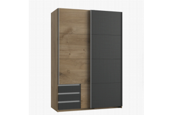 De schuifdeurkast Elsen heeft aan de linkerkant veel plankruimte, ideaal voor het opbergen van je kleding. Daaronder bevinden zich 3 laden waarin je kleine artikelen zoals ondergoed en sokken kunt opbergen. Deze laden zijn handig vanaf de buitenkant van de kast te gebruiken. Aan de rechterkant van de kast bevindt zich een plank met daaronder een roede voor het ophangen van je kleding.