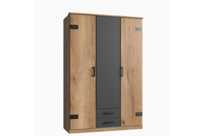 Ben je op zoek naar een kledingkast met een stoere uitstraling? Dan hoef je niet verder te zoeken, want kast Stratum heeft alles wat je nodig hebt. Met een breedte van 135 cm, 3 deuren en 2 handige laden biedt deze kast voldoende opbergruimte voor al je kleding. Het decor van de kast combineert een robuuste houtlook met grafiet, wat zorgt voor een stoere uitstraling. De metalen grepen en stalen popnagels op de deuren dragen bij aan het stoere accent van de kast. Met kast Stratum haal je een absolute eyecatcher in huis!
