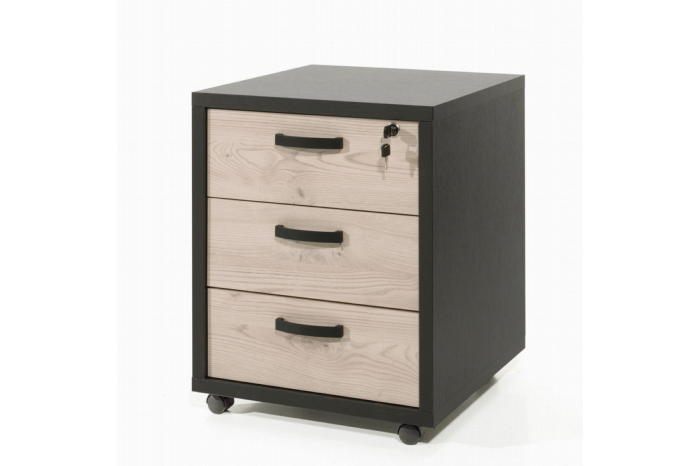 Dit ladeblok uit de kantoorcollectie Spinoza heeft een trendy uitstraling door de afwerking in lichtkastanje hout met zwart accenten. De strakke zwarte handvatten maken het moderne meubel helemaal af. De platen zijn afgewerkt met een sterk krasvast melamine toplaag. Het ladeblok heeft 3 lades met een slot zodat u uw spullen veilig kunt opbergen. Dit ladeblok past perfect bij één van de bureaus of de andere kasten uit de serie Spinoza.