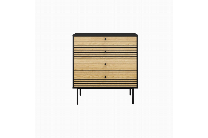 Deze handige ladekast is een echte eyecatcher in je interieur. De ombouw van de kast is vervaardigd uit een sterke MDF en afgewerkt met een stevige melamine coating. De fronten van de kast zijn afgewerkt met een eiken fineer. Voldoende opbergruimte voor al je spullen in de vier laden, bovenop de kast is plaats voor enkele accessoires. Gemakkelijk te monteren doormiddel van bijgeleverde montagehandleiding. Bekijk ook de andere elementen uit deze serie!