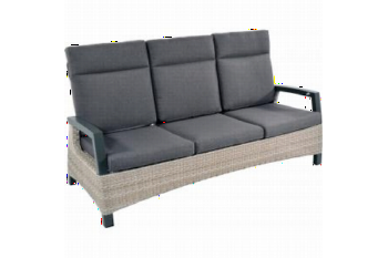 Prato Mountain 3-zits lounge tuinbank Specificaties: Breedte: 195 cm Diepte: 80 cm Hoogte: 104 cm Materiaal frame: aluminium Wicker: Wicker 8x2mm / 7x2.2mm / 14x2.3mm Kleur wicker: Beige Kleur kussens: Grijs Aantal zitplekken: 3 Verstelbare rugleunin...