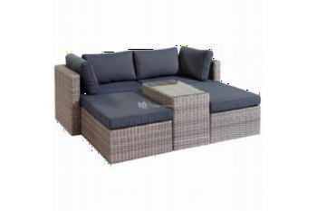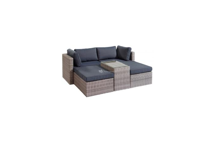 Tommy 2-zits lounge tuinbank Specificaties: Afmeting hoek (2x): 72 x 94 x 66 cm Afmeting hocker (2x): 63 x 84 x 32.5 cm Afmeting tafel: 41 x 71 x 52.5 cm Materiaal afwerking: Halfrond wicker Materiaal frame: Alumium Materiaal tafelblad: Glas Aantal z...