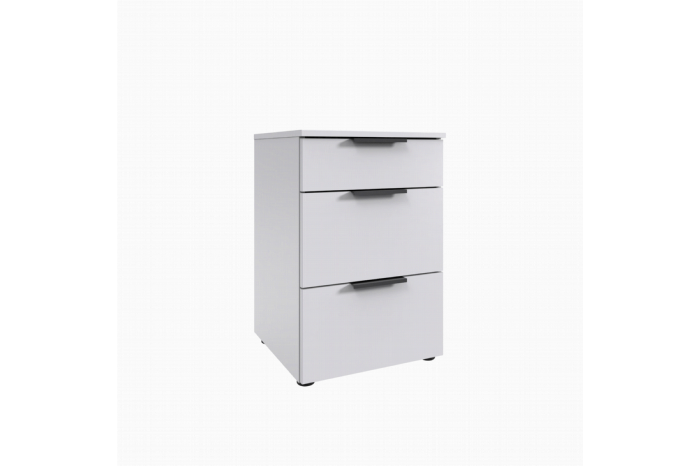 Nachtkastje Elda is 41 cm breed, 41 cm diep en 61 cm hoog. Het is gemaakt van plaatmateriaal met een folie afwerking in wit decor. De 3 lades hebben zwart metalen handgrepen. Het ladekastje moet nog gemonteerd worden.