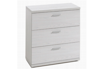 Dit nachtkastje heeft 3 laden met aluminium-kleurige grepen.
