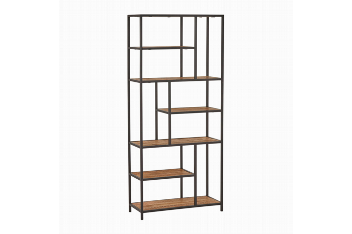 Deze vakkenkast heeft door het gebruik van massief mangohout en zwart metaal een industriële look. Door de verschillende hoogtes van de planken heeft de kast een speelse uitstraling en is er ruimte voor spullen van verschillende afmetingen. In de vakkenkast kunnen bijvoorbeeld planten, fotolijstjes, vakantiesouvenirs of kunstwerken worden uitgestald zodat deze een mooie plek krijgen in uw interieur!