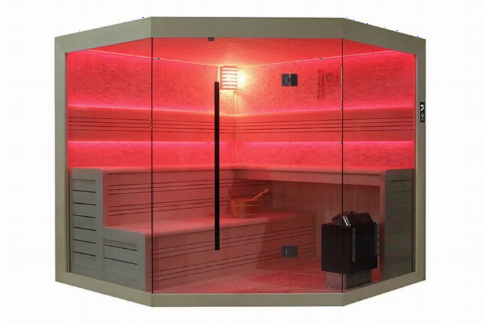 De Marriott zit boordevol heerlijke features. Het interieur van deze vernieuwde sauna is geproduceerd van abachi hout. Voordeel van dit hout is dat de temperatuur ervan altijd comfortabel aanvoelt, ongeacht de hitte in de saunacabine. Verder is deze sauna uitgerust met een kristallen wand, die warmte opneemt en verspreid weer afgeeft, voor een nog intensere sauna-ervaring. U ontspant in de sauna altijd in de juiste sfeer, dankzij het ingebouwde muzieksysteem, dat u eenvoudig vanuit de cabine kunt bedienen met een afstandsbediening. Kortom: in de Marriott wordt elke liefhebber van wellness volledig in de watten gelegd. Dit product is exclusief een kachel.
