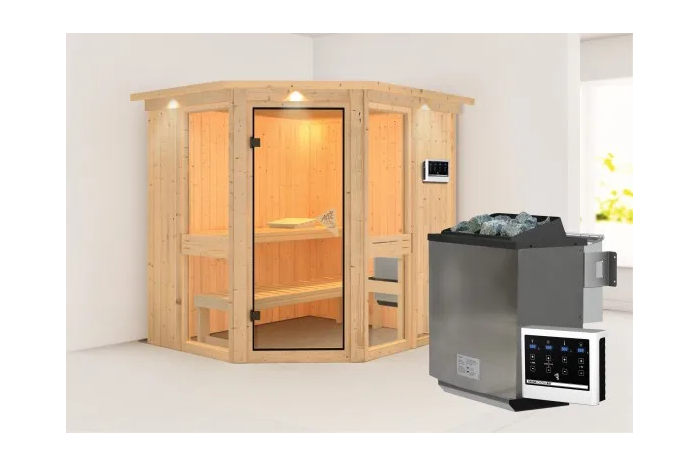 Karibu | Amelia 1 Sauna met Dakkraag | Bronzeglas Deur | Biokachel 9 kW Externe Bediening