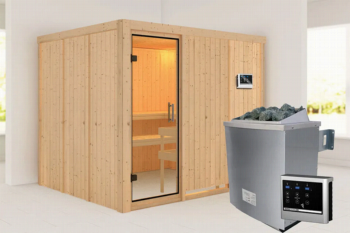 Karibu | Gobin Sauna | Helderglas Deur | Biokachel 9 kW Externe Bediening