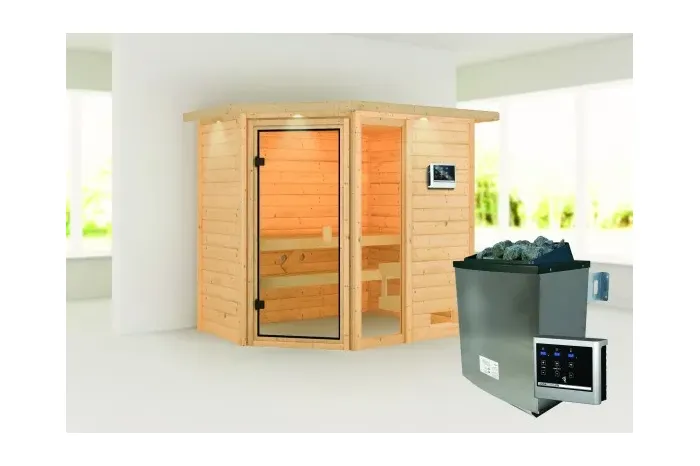 De Jada sauna is een compacte sauna met een hoekmodel vormgeving. De sauna heeft diverse mogelijkheden qua deur- en kacheltype en kan gespiegeld opgebouwd worden. Met een 8mm bronzeglas deur. De sauna is uitgevoerd met een dakkraag, waarin verlichting geïntegreerd is. Daarnaast wordt de sauna verkocht inclusief: 1 x bank hoog: 57 cm, 1 x bank laag 27 cm en kachelrek. Exclusief: Licht, vloer, vloerrooster en Classic hoofdsteun. Als u de sauna volledig wilt personaliseren, kunt u een kijkje komen nemen bij Fonteyn. Hier kunt u samen met een adviseur de perfecte sauna samenstellen.