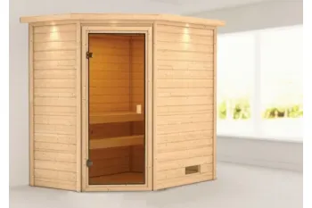 De Jella sauna is een compacte sauna met een hoekmodel vormgeving. De sauna heeft diverse mogelijkheden qua deur- en kacheltype en kan gespiegeld opgebouwd worden. Met een 8mm bronzeglas deur. De sauna is uitgevoerd met een dakkraag, waarin verlichting geïntegreerd is. Daarnaast wordt de sauna verkocht inclusief: 1 x bank hoog: 57 cm, 1 x bank laag: 27 cm en kachelrek. Exclusief: Kachel, licht, vloer, vloerrooster en Classic hoofdsteun. Als u de sauna volledig wilt personaliseren, kunt u een kijkje komen nemen bij Fonteyn. Hier kunt u samen met een adviseur de perfecte sauna samenstellen.