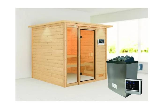 Karibu | Jutta Sauna met Dakkraag | Kachel 9 kW Externe Bediening
