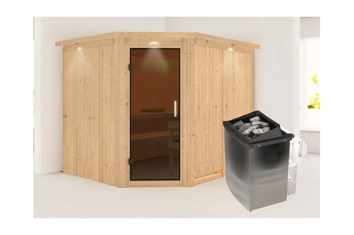 Introductie: Malin Sauna met Dakkraag van FonteynnDe Malin Sauna met Dakkraag van Fonteyn is een prachtig product dat een perfecte aanvulling is op elke woning. Deze sauna is ontworpen met een compact hoekmodel, waardoor het ook geschikt is voor kleinere ruimtes. Het is een product dat zowel stijl als functionaliteit biedt.nnUiterlijke Kenmerken: Warmte en RustnMet een warme en rustgevende uitstraling dankzij de lichte houtkleur van de buitenkant, heeft de Malin Sauna met Dakkraag van Fonteyn een hoekige afwerking die het ideaal maakt voor plaatsing in hoeken van ruimtes. De deur, vervaardigd van getint glas, is voorzien van een stevige handgreep voor gemakkelijke toegang. Aan de buitenkant zijn ook lampen te zien die voor een sfeervolle verlichting zorgen.nnFunctionaliteit: Efficiënte VerwarmingnUitgerust met een moderne saunakachel, zichtbaar aan de buitenkant, zorgt de Malin Sauna met Dakkraag van Fonteyn voor een efficiënte verwarming van de ruimte. Het biedt diverse mogelijkheden qua deur- en kacheltype en kan gespiegeld opgebouwd worden. Daarnaast wordt de sauna verkocht inclusief twee hoge banken, een lage bank, een kachelrek en een Classic hoofdsteun.nnFinse Sauna: Traditioneel en AuthentieknAls een typische Finse sauna, wordt de Malin Sauna met Dakkraag van Fonteyn gekenmerkt door het gebruik van een oven, al dan niet met een bevochtiger. Bovenop de oven liggen stenen die extra vocht kunnen absorberen wanneer er water op wordt gegoten, wat zorgt voor stoomafgifte. Dit is een kenmerk van de traditionele Finse sauna, die bekend staat om zijn authentieke en ontspannende ervaring.n