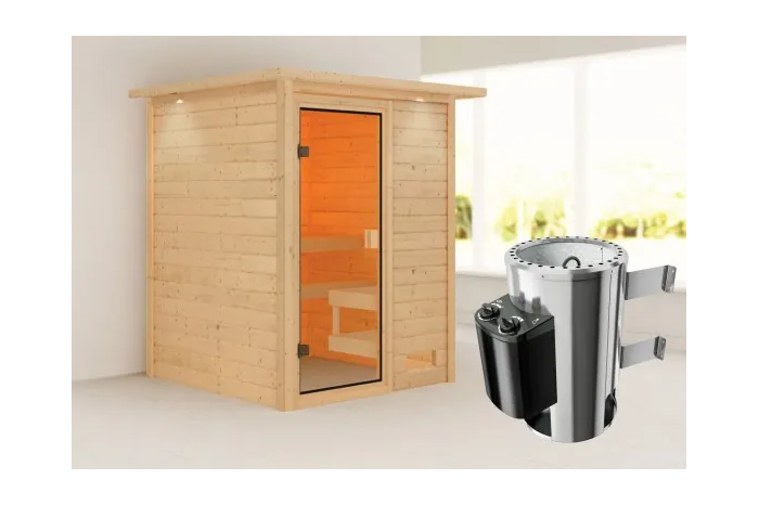 De Sandra sauna is een compacte sauna met een vierkante vormgeving. De sauna heeft diverse mogelijkheden qua deur- en kacheltype en kan gespiegeld opgebouwd worden. Met een 8mm bronzeglas deur. De sauna is uitgevoerd met een dakkraag, waarin verlichting geïntegreerd is. Daarnaast wordt de sauna verkocht inclusief: 1 x bank hoog: 57 cm, 1 x bank laag: 27 cm en kachelrek. Exclusief: Licht, vloer, vloerrooster en Classic hoofdsteun. Als u de sauna volledig wilt personaliseren, kunt u een kijkje komen nemen bij Fonteyn. Hier kunt u samen met een adviseur de perfecte sauna samenstellen.