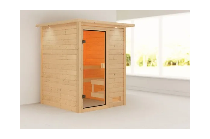 De Sandra sauna is een compacte sauna met een vierkante vormgeving. De sauna heeft diverse mogelijkheden qua deur- en kacheltype en kan gespiegeld opgebouwd worden. Met een 8mm bronzeglas deur. De sauna is uitgevoerd met een dakkraag, waarin verlichting geïntegreerd is. Daarnaast wordt de sauna verkocht inclusief: 1 x bank hoog: 57 cm, 1 x bank laag: 27 cm en kachelrek. Exclusief: Kachel, licht, vloer, vloerrooster en Classic hoofdsteun. Als u de sauna volledig wilt personaliseren, kunt u een kijkje komen nemen bij Fonteyn. Hier kunt u samen met een adviseur de perfecte sauna samenstellen.