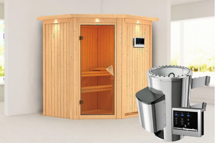 Karibu | Tonja Sauna | Bronzeglas Deur | Biokachel 3,6 kW Externe Bediening