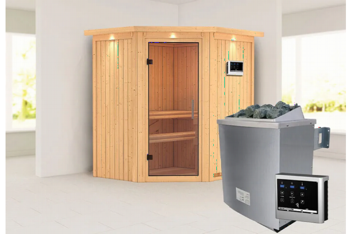 Karibu | Tonja Sauna met Dakkraag | Helderglas Deur | Biokachel 3,6 kW Externe Bediening