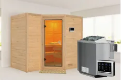 Karibu | Sahib 2 Sauna | Helderglas Deur | Biokachel 9 kW Externe Bediening Introductie Sahib 2 Sauna van KaribunErvaar de unieke wellnessbeleving van de Sahib 2 Sauna van Karibu van Fonteyn.€ 3639,99