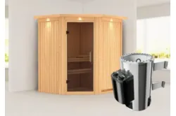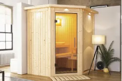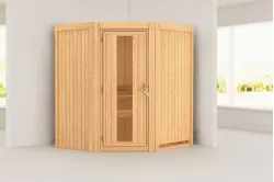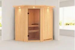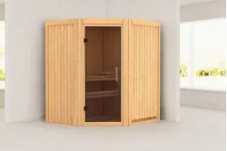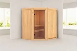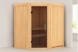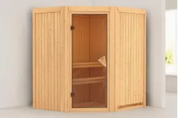 Karibu | Tonja Sauna | Helderglas Deur | Biokachel 3,6 kW Externe Bediening Introductie Tonja Sauna KaribunDe Tonja Sauna van Fonteyn is een compacte sauna met een hoekmodel vormgeving.€ 2709,99