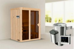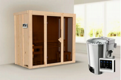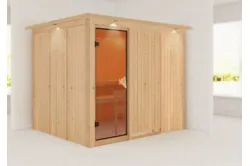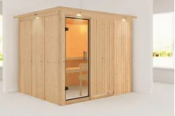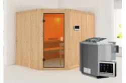 Karibu | Horna Sauna | Kachel 9 kW Geïntegreerde Bediening De Horna sauna is een compacte sauna met een hoekmodel vormgeving. De sauna heeft diverse mogelijkheden qua deur- en kacheltype en kan gespiegeld opgebouwd worden. Met een 8mm bronzeglas deur.€ 2659,99