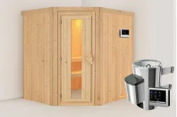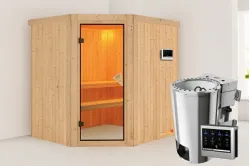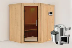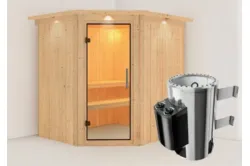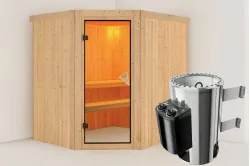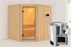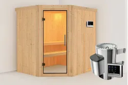 Karibu | Kotka Sauna | Kachel 9 kW Geïntegreerde Bediening De Kotka sauna is een compacte sauna met een hoekmodel vormgeving. De sauna heeft diverse mogelijkheden qua deur- en kacheltype en kan gespiegeld opgebouwd worden. Met een 8mm bronzeglas deur.€ 2559,99