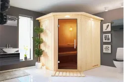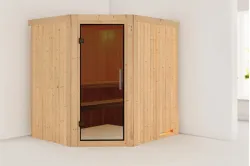 Karibu | Lilja Sauna | Bronzeglas Deur | Kachel 3,6 kW Externe Bediening Introductie Lilja Sauna van FonteynnDe Lilja Sauna van Fonteyn, een compacte sauna met een hoekmodel vormgeving, is gemaakt van hout en heeft een lichte, natuurlijke houtkleur.€ 2769,99