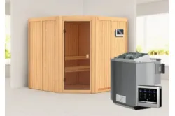 Karibu | Kotka Sauna | Biokachel 9 kW Externe Bediening De Kotka sauna is een compacte sauna met een hoekmodel vormgeving. De sauna heeft diverse mogelijkheden qua deur- en kacheltype en kan gespiegeld opgebouwd worden. Met een 8mm bronzeglas deur.€ 3029,99