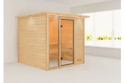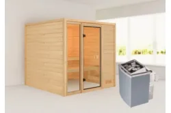 Karibu | Jutta Sauna | Biokachel 9 kW Externe Bediening De Jutta sauna is een compacte sauna met een rechthoekige vormgeving. De sauna heeft diverse mogelijkheden qua deur- en kacheltype en kan gespiegeld opgebouwd worden. Met een 8mm bronzeglas deur.€ 2959,99