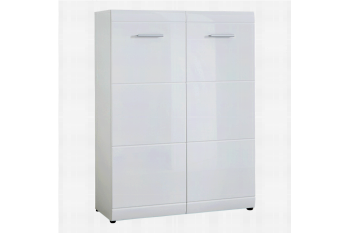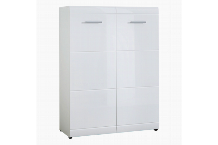 Jeugdig en kompact ! Een hoge 2-deurs schoenenkast uitgevoerd met witte hoogglans mdf fronten. Met deze brede, hoge schoenenkast voor maar liefst ca. 24 paar schoenen wordt uw hal of bijkeuken een doelmatige ruimte ! De schoenenkast heeft 2 grote deuren met afgeronde boven- en onderkanten. Achter de deuren 6 legplanken voor het opbergen van al uw schoenen. De kast heeft 2 brede metaalkleurige handgrepen.
