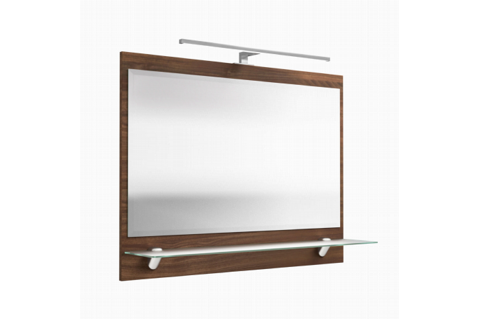 Door zijn platte design is deze spiegel een goed alternatief voor de conventionele spiegelkast. Om je spullen kwijt te kunnen is er een mat glazen plank aanwezig. Voor goed licht is er een chroomkleurige ledlamp op de spiegel gemonteerd van 8 watt. Deze spiegel is 90cm breed, 68cm hoog en 22cm diep en verkrijgbaar in het walnoot en antraciet.