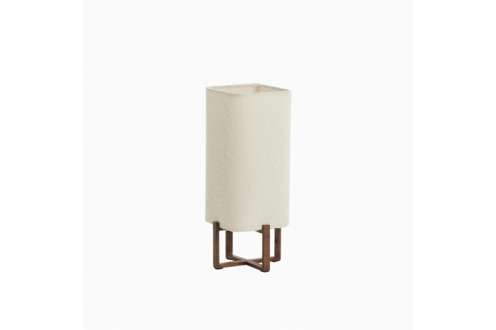 Het zachte licht van tafellamp Wyn zorgt voor een serene sfeer in je ruimte. De hoge kap met afgeronde, vierkante vorm is bekleed met bouclÉ in een romige crÈmekleur.De metalen kruisvoet met donkerbruine houtlook, geeft een eigentijdse en toch tijdloze uitstraling. Tafellamp Wyn past perfect in elke moderne setting en voegt net dat beetje extra stijl toe aan je interieur.LichtbronIn tafellamp Wyn gaat een gloeilamp met een grote fitting type E27, deze wordt niet meegeleverd. Om je lamp compleet te maken, vergeet dan niet om er de juiste lichtbron bij aan te schaffen.