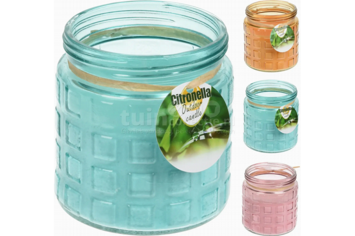 Citronella Kaars Ø11cm Assorti 1stGeniet van heerlijk geurend kaarslicht in de tuin of op het terras met deze citronella kaars. De citronella kaars zit in een kleurrijke glazen pot en is verkrijgbaar in roze, blauw en oranje. De glazen pot met citronella kaars heeft een diameter van 11cm en een hoogte van 12cm. Plaats deze tuinkaars met citroengeur altijd op een onbrandbare ondergrond.Specificaties Aantal: 1 stuk Hoogte: 12cm Diameter: 11cm Kleur: Roze, blauw of oranje Materiaal: Glas en was Geschikt voor buiten*Let op: Dit artikel is verkrijgbaar in 3 kleuren; roze, blauw en oranje. Mocht je een voorkeur hebben voor kleur, geef dit dan bij Opmerking door in het bestelproces. We proberen zoveel mogelijk rekening met je voorkeur te houden, maar dit is afhankelijk van de voorraad.