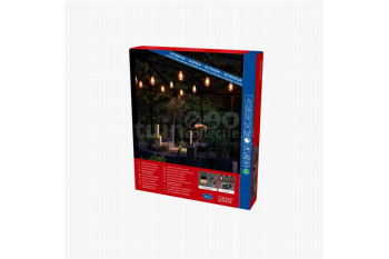 Konstsmide Partylights Edison 10 LED 4,5m Dimbaar + Vervangbare LEDMet de Edison Partylight set van Konstsmide breng je veel sfeer in de tuin, onder de overkapping of binnen in huis! Dit lichtsnoer bestaat uit 10 LED lampjes met amberkleurig licht en een zwarte kabel. De kunststof lampjes, met een langwerpige vorm (Edisonlamp), zitten met een tussenruimte van 50cm verdeeld over het 4,5 meter lange snoer. Het bijzondere aan deze set is dat de lampjes met een extra kabel onder het hoofdsnoer hangen. De lengte van de extra snoeren is 43cm. Verder heeft het hoofdsnoer een totale lengte van 14,5 meter, inclusief het aanloopsnoer van 10 meter en de trafo. Daarnaast is dit lichtsnoer voorzien van een dimmer met 4 verschillende lichtstanden. Een ander voordeel is dat de lichtbronnen vervangbaar zijn. Hiervoor zijn speciale reservelampjes verkrijgbaar. Dit lichtsnoer is geschikt voor binnen- en buitenshuis. Voor een optimale levensduur van de partylights raden we aan het lichtsnoer, in de wintermaanden en wanneer het niet gebruikt wordt, binnen op te bergen. Voordelen Dimbare lampjes Vervangbare lichtbronnen Geschikt voor binnen en buitenSpecificaties Aantal lampjes: 10 LED Afmeting peer: 10cm - Ø5,5cm Vorm peer: Edisonlamp Kleur verlichting: Amber Totale lengte snoer: 14,5m Lengte snoer met lampjes: 4,5m Lengte aanloopsnoer: 10m Afstand tussen lampjes: 50cm Kleur peren: Transparant Kleur snoer: Zwart Materiaal: Kunststof Gebruik: Binnen en buiten Soort set: Basic set Trafo: IP44 - 24V - spatwaterdicht Lichtbron (lampje) is vervangbaar Verwachte levensduur: ca. 50.000 branduren Opbrengst: 10x 0,7W Type: 2365-800 Type reservelampje: 5693-120