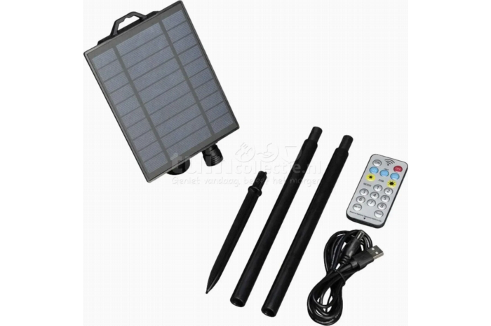 Konstsmide Solar Paneel voor PartylightsLaat jouw Konstsmide partylights nu ook heel eenvoudig op zonne-energie stralen! Deze solar panel battery box van Konstsmide kan gekoppeld worden op de 24V-31V lichtsnoeren van dit merk met een maximum van 200 LED lampjes. De set bestaat uit een zonnepaneel met grondpin in 3 verschillende hoogtes, een 1,8m lange oplaadkabel, sensor en een afstandsbediening met dimmer- en timerfunctie. Daarbij is er bij de timerfunctie te kiezen voor 4 uur, 6 uur of 8 uur brandtijd van de partylights. De USB-oplaadkabel kan gebruikt worden als er te weinig zonlicht is geweest. Verder stel je de lichtsterkte en timerfunctie in middels de afstandsbediening die een bereik van 8 meter heeft. Plaats het zonnepaneel op een zonnige plek in de tuin, sluit het snoer aan op de set partylights van Konstsmide en geniet van een duurzame manier van verlichten!Specificaties Aantal: 1 set Hoogte: 14cm, 34cm of 54cm Kleur: Zwart Materiaal: Kunststof Werkt op: Zonne-energie (incl. oplaadbare batterij) Incl. Sensor en afstandsbediening met dimfunctie en timerfunctie Koppelbaar met de 24-31V Partylights (max. 200 LED) Gebruik: Buiten