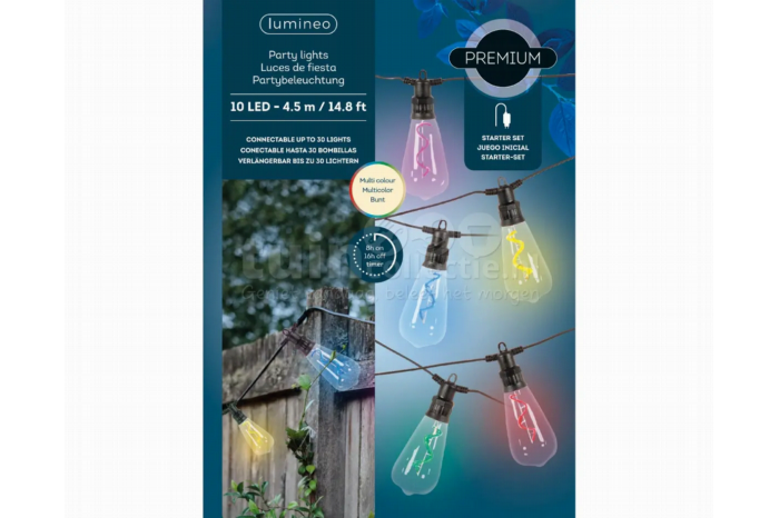 Partylights Startset Connectable 10 LED 4,5m MultiMet dit multicolor lichtsnoer is jouw tuinfeestje helemaal compleet! Deze Lumineo partylights startset bestaat uit een zwart snoer van 4,5 meter lang met daaraan 10 LED lampjes. Het aanloopsnoer is 5 meter lang. De langwerpige kunststof peren zijn 11x6,5cm groot en schijnen met diverse kleurrijke kleuren. Deze startset wordt geleverd inclusief IP44 trafo (stekker), waardoor hij zowel binnen als buiten gebruikt kan worden. Ook is dit lichtsnoer koppelbaar tot 30 LED lampjes (3 sets in totaal). Verder is de partylight set voorzien van een handige timerfunctie. Kies je voor de timerfunctie, dan brandt de verlichting 8 uur lang en gaat daarna automatisch voor 16 uur uit gaat. De lampjes gaan de volgende dag automatisch weer aan op het tijdstip waarop ze de eerste keer zijn ingeschakeld.Materiaal en onderhoudDe Partylights van Lumineo zijn voorzien van een zwart rubber snoer met kunststof peertjes. Elk lampje heeft een handige ophangoog, waardoor ze op diverse manieren te bevestigen zijn aan bijv. een pergola, boom of overkapping. Voor een optimale levensduur van de partylights raden we aan de partylights in de wintermaanden en bij niet-gebruik, waar mogelijk, binnen op te bergen. Specificaties Aantal lampjes: 10 LED Lengte peer: 11,3cm Diameter peer: 6,3cm Kleur verlichting: Multicolor Totale lengte snoer: 800cm Lengte snoer met lampjes: 500cm Lengte aanloopsnoer: 500cm Afstand tussen lampjes: 50cm Kleur snoer: Zwart Materiaal: Kunststof Gebruik: Binnen en buiten Werkt op: Netstroom - IP44 trafo (inbegrepen) Lampjes zijn niet vervangbaar Timerfunctie: Ja Dimfunctie: Nee Extra: Startset - Connectable