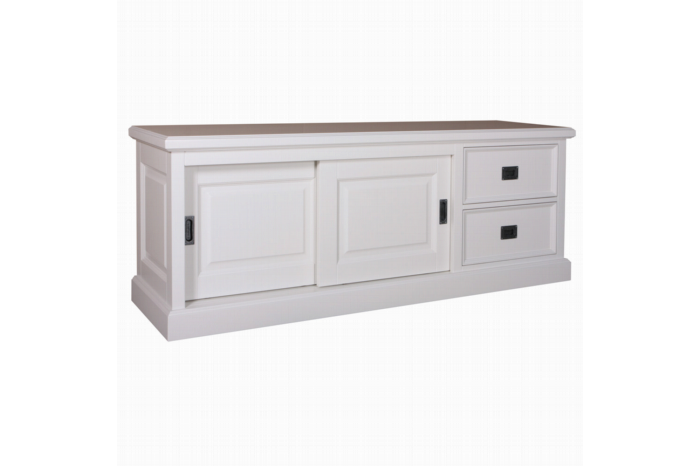 Stijlvol TV-dressoir, bestaande uit 2 schuifdeuren op een aluminium rails, de laden zijn voorzien van softclose.Er is keuze uit diverse kleuren en verschillende soorten beslag. De bovenbladen zijn ook verkrijgbaar in eiken.
