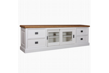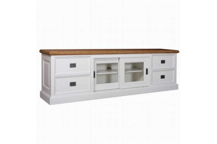 Royal landelijk TV-dressoir, voorzien van 2 schuifdeuren waarachter de audio-apparatuur geplaatst kan worden en 4 handige opbergladen aan de zijkantSchuifdeuren lopen over een aluminium rails voor optimaal gebruik en de laden zijn voorzien van softclose.Er is keuze uit diverse kleuren en verschillende soorten beslag.
