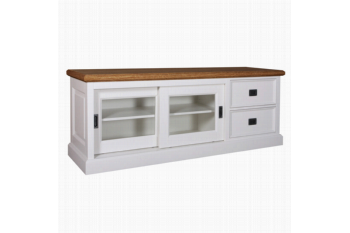 Landelijk en stoer TV-dressoir, voorzien van 2 schuifdeuren waarachter de audio-apparatuur geplaatst kan worden en 2 handige opbergladen.Schuifdeuren lopen over een aluminium rails voor optimaal gebruik en de laden zijn voorzien van softclose.Er is keuze uit diverse kleuren en verschillende soorten beslag.