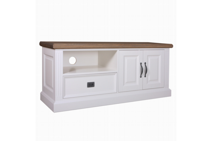 Compact TV-dressoir met handige opbergruimte, zo is er onder het open vak een lade geplaatst en aan de rechterkant zit een opbergvak 2 openslaande deuren.U heeft de mogelijkheid om het TV-dressoir met een antiek finish af te laten werken, de randen worden licht opgeschuurd en bewerkt zodat er een antiek uitstraling ontstaat.Stel u eigen TV-dressoir samen door u eigen kleur te kiezen, zo heeft u o.a. de keuze uit diverse soorten beslag.