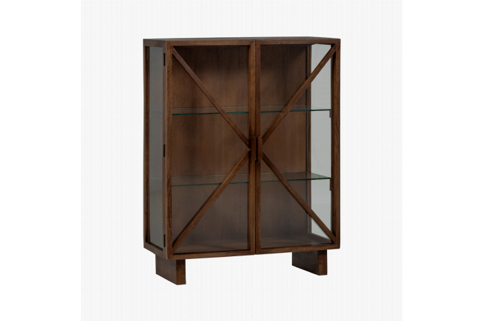 Breng warmte en karakter in je interieur met vitrinekast Kella van interieurmerk WOOOD. Het hout met een donkerbruine kleur in combinatie met glas zorgt voor een moderne, natuurlijke uitstraling. Het mangohout heeft zichtbare nerven en kleurnuances, en deze kenmerken zorgen ervoor dat elke Kella kast uniek is. Vitrinekast Kella is perfect om je mooiste items, servies of woonaccessoires in tentoon te stellen zonder in te leveren op stijl.Indeling:Kella is een tweedeurs kast, en deze vitrinekast heeft er twee glasplaten in. Hierdoor ontstaan 3 vakken van elk 37,5 cm hoog. Elke plank heeft een maximaal draaggewicht van 7 kg.Levering & montage:Vitrinekast Kella wordt geleverd in twee pakketten en is eenvoudig te monteren aan de hand van de bijgeleverde montage-instructie. Door de kast middels de valpreventie aan de muur te borgen, behoudt je de kast van kantelen en voorkom je ongelukken. Plaats viltglijders aan de onderzijde van de poten voor het beschermen van harde vloeren.