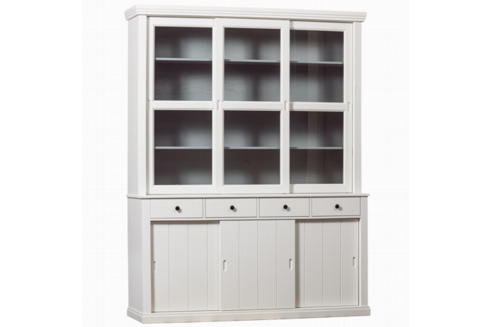 Het vitrinegedeelte van Lagos is minder diep dan de onderkant. De kast heeft 3 schuifdeuren met glas en in dit deel bevinden zich 3 planken, waardoor er veel ruimte is voor servies en andere spullen. Het onderste kastgedeelte heeft 4 lades en daaronder bevinden zich opbergvakken die afgesloten worden met 3 schuifdeuren.