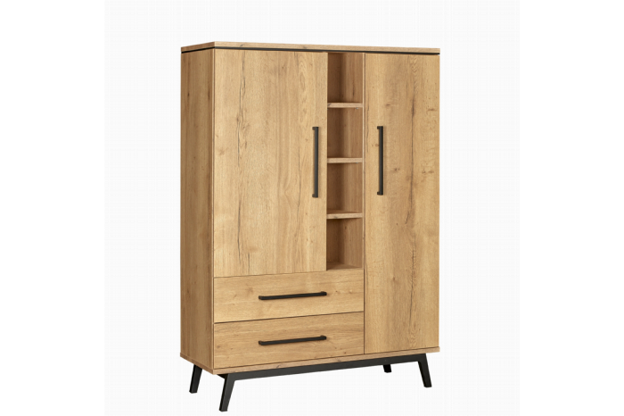 De kast heeft aan de linkerkant een deur met daaronder 3 laden. De laden sluiten soepel en geruisloos dankzij het softclose systeem. Aan de rechterkant bevindt zich een deur over de volledige lengte van de kast. De kast biedt veel opbergruimte in de gesloten delen. In het midden van de kast zijn er enkele open vakken, ideaal voor het plaatsen van boeken of woonaccessoires. Door de hoogte van de kast kun je ook woonaccessoires of een mooie lamp bovenop de kast plaatsen.